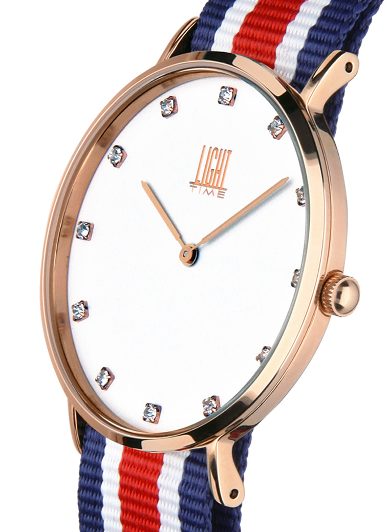 Movimento al quarzo, Cassa in acciaio IP rosè in tre pezzi, Fondello in acciaio, Quadrante con strass, Vetro minerale, Diametro cassa 40 mm. Cinturino passante in nylon.