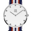 Movimento al quarzo, Cassa in acciaio in tre pezzi, Fondello in acciaio, Quadrante con strass, Vetro minerale, Diametro cassa 40 mm. Cinturino passante in nylon.
