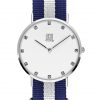 Movimento al quarzo, Cassa in acciaio in tre pezzi, Fondello in acciaio, Quadrante con strass, Vetro minerale, Diametro cassa 36 mm. Cinturino passante in nylon.