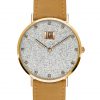 Movimento al quarzo, Cassa in acciaio IP rose in tre pezzi , Fondello in acciaio, Quadrante pavè con strass, Vetro minerale, Diametro cassa 36 mm. Cinturino in pelle scamosciata marrone.