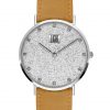 Movimento al quarzo, Cassa in acciaio in tre pezzi, Fondello in acciaio, Quadrante pavè con strass, Vetro minerale, Diametro cassa 36 mm. Cinturino in pelle scamosciata marrone.